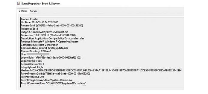The ‘DatabasePath’ value from the ‘..InstalledSDB’ registry entry contains the location of the custom SDB file. Registry key creation may be detected by Sysmon and will be noted with Event ID 12 as illustrated in Figure 19.