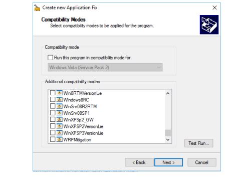 The unsaved Shim database hits the Fix button at the top of the window with New Database chosen (the default). The prompt for creating a new application repair will then be displayed. Here, some fundamental areas are filled in with details on the patch that is being made. Except for the path of the executable that must be Shimmed, they are filled in with false information. The compatibility modes are presented in Figure 8. If an actual executable had needed fixing, this would have been crucial. or legitimately applying the Shimming. This step can be skipped since this research isn’t doing any of that; simply click the “Next” button to continue. On the following screen, there are compatibility modes. These provide ways to make older programs run on more modern hardware by fabricating the environment (OS Version, graphics modes, etc). By selecting next, skip those that are not pertinent to this example.