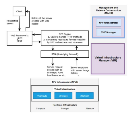 To implement the proposed solution, open-source cloud computing infrastructure software OpenStack is used. SFC orchestration is carried out using OpenStack software. OpenStack contains components such as Glance, Neutron, and Nova that are used for SFC orchestration. The users interact with APIs to interact with SFC components using the SFC orchestrator. The SFC request is sent to the SFC engine (orchestrator) using APIs. The existing well-known frameworks use REST-based APIs. The proposed gRPC-based approach can also be used to do the same orchestration. The components of Nova architecture are described as follows: