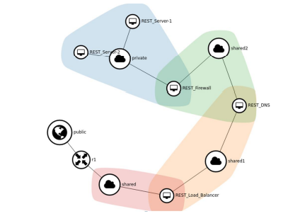 Use case 3. This scenario is built on top of the use case 2 topology. The user requests multiple servers along with a load balancer and Domain Name System (DNS) as a service. These services are commonly used in deploying hosts on a private a DNS server. Figure 9 depicts the topology of a client requesting services with two servers connected from one network to DNS server (private to shared1) and followed by a load balancer on another network (shared).