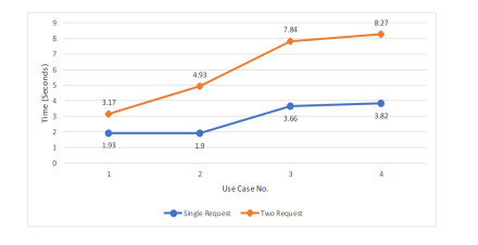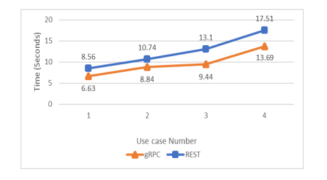 Figure 13 shows the gRPC performance over REST in terms of service execution time. The use case results data shows that for two requests, the gRPC results in are improved (at least twice) over a single request.