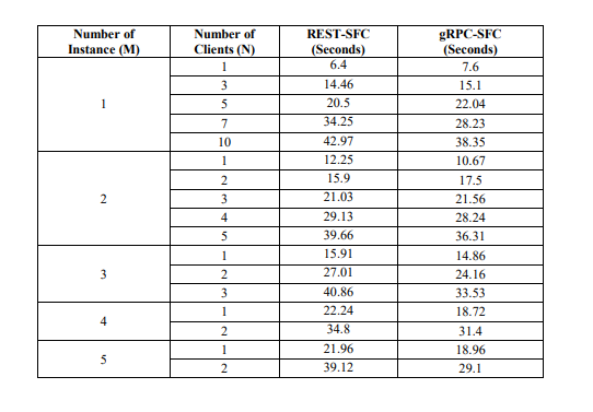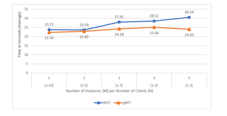 The results are carried out for the ‘N’ number of clients and each client contains the ‘M’ number of instances. Table II shows the simulation range for the ‘M’ number of instances across the ‘N’ number of clients. For example: for three clients, the results are obtained for 1, 2, and 3 instances per request each. The average time is calculated for ‘M’ instances, the results clearly show that gRPC- based orchestration is faster than REST -based orchestration (Ref. Figure 6.)