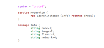 The service definitions file contains the instance name, image id, flavor ID, and network id to provide a structure. The information is defined in a proto file along with the request and response format as shown in Figure 5.