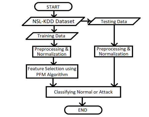For the purpose of the experiment, the authors have used both NSL-KDD and Kyoto datasets. These datasets are needed to be pre-processed and normalized. These contain many redundant values and sometimes the values are not in the form to be directly used for training and testing IDS. So those values need to be in proper numerical form for the purpose to serve. After preprocessing and normalization, the datasets are applied on the proposed model [24]. The PFM Algorithm is then applied over the training data to reduce the dimensions of the data by deleting the irrelevant features. The algorithm based on the mating behavior of Peafowl generates feature subsets out of the complete dataset. After that, the testing dataset is used for classification using different classifiers. Figure 1 depicts the progress of the proposed model.