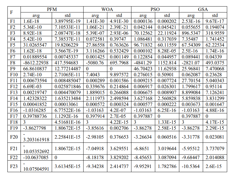 The exploitation capability of the proposed algorithm is evaluated using the unimodal benchmark functions F1-F7 because they have only one global optimum. Comparative results show that the PFM algorithm provides very good exploitation. To evaluate the ability of exploration of the optimization algorithm, F8-F23 benchmark functions are considered. F8 to F23 functions are multimodal functions that include multiple local optima which increase exponentially with the size of the problem. Comparative results also show very good exploration capabilities of the proposed meta-heuristic algorithm. Table 1 reflects that the proposed novel PFM algorithm makes a balance between the exploitation as well as exploration during the search and is also successful in finding the optimum solution.