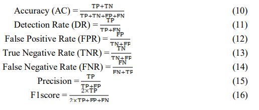 Performance of any IDS depends on four parameters [36] – True Positive (TP), True Negative (TN), False Negative (FN) and False Positive (FP). Based on these four parameters, performance metrics are calculated which are as follows: