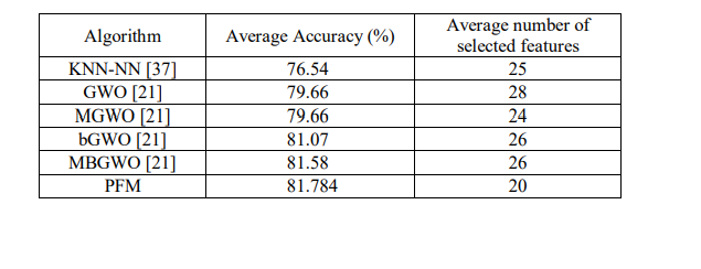 Here, the authors extracted three Feature Subsets (FSs) from the original NSL-KDD dataset with the feature number counts of 21, 19 and 19 features respectively. For each selected FSs, the Accuracy (AC), Detection Rate (DR) and False Positive Rate (FPR) have been calculated with selected features and using all features. It is found that in every case, reduced set of features gave better performance as well as consumed less memory space. Hence, the proposed PFM algorithm creates a robust and efficient IDS. The proposed model was also compared with GWO, MGWO, BGWO and MBGWO algorithms. Results obtained from experiments highlight that the proposed algorithm achieves higher accuracy. The comparison depicted in Table 5 shows that the proposed model outperforms the models developed by other authors. After classification, Table 6 shows all the performance metrics for FSs1. Fig. 6 to Fig. 10 illustrate all the performance metrics for FSs1 using NN, DT, KNN, Bagging and RF respectively.