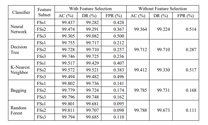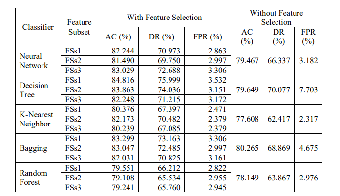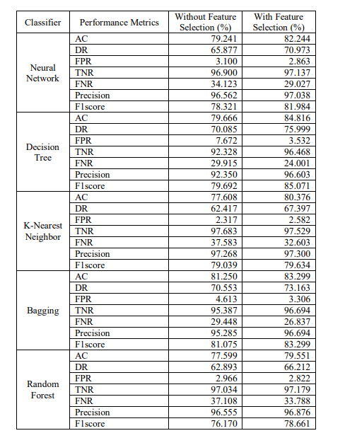 Table 6. Performance metrics of FSs1 of NSL-KDD dataset