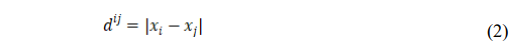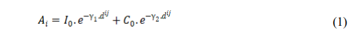 where, γ1 and γ2 are sound wave distortion coefficient and color absorption coefficient respectively. Values for γ1 and γ2 are given as γ1, γ2 ∈ [0, +∞). The value of dij for two peafowls i and j is basically the Euclidean distance between co-ordinates xi and xj which can be given as