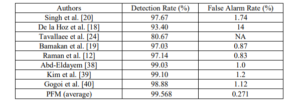 Apart from this, in this scenario a comparative study featuring the recent advancements in IDS on DR and FPR is shown. This study is presented in Table 9. From these comparisons, it is evident that the proposed IDS model based on Peafowl Mating algorithm performs better than other mentioned IDS models. The PFM algorithm detects intrusions with high efficacy resulting the DR to be 99.568% as well as rarely misjudges normal packets as attacks which generates FPR of 0.271% only on an average.