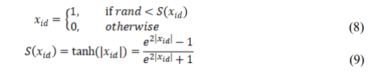 Once the set of newborn peafowl is calculated as new, the value of newkd (i.e., d th dimension of the k th data point) can be either in the range of 0 to 1 or out of it. There is a need to transform the real values into binary i.e., 0 or 1 as the selected features are needed to be extracted. So, a probabilistic rule which is based on hyperbolic tangent function is applied to each dimension of the position vector. Equation (8) gives the formula of the function.