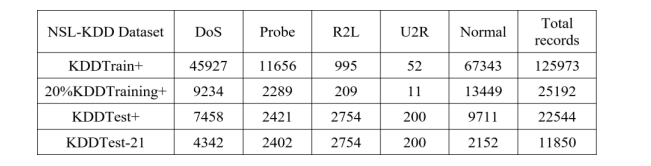 In 2009, M. Tavallaee et al. proposed NSL-KDD dataset which is a benchmark dataset and is often used for identifying intrusion [26]. This dataset is derived from KDDCUP’99 dataset. The dataset consists of 4 components, ‘KDD Train+’, ‘KDD Test+’, ‘20% KDD Training’ and ‘KDD Test-21’. In this paper for measuring the performance of the proposed IDS model, KDD Train+ is used for training and KDD Test+ is used for testing. KDD Train+ contains 1,25,973 records and KDD Test+ contains 22,544 records. Each record consists of 41 features, labelled as normal or specific attack types [27, 28]. Figure 2 shows the statistical records in NSL-KDD dataset. Both of the train and test dataset contains the signature of various types of attacks, which are categorized into four types – Denial of Service (DoS), Probe, User to Root (U2R), Remote to Local (R2L).