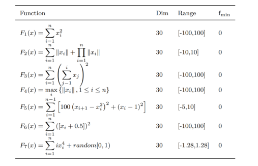 The numerical proficiency of the proposed Peafowl algorithm is tested using 23 classical benchmark functions. To show the superiority of PFM, it is compared with a number of swarmbased optimization algorithms. The population size of 30 and 500 iterations are taken for each algorithm. All benchmark functions [31, 32] are explained in figure 3, 4 and 5.