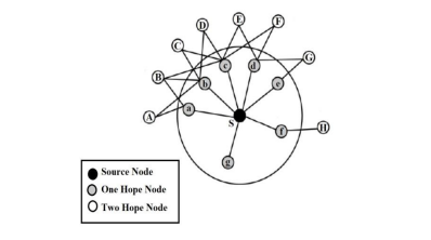 For the entire network nodes to master their own topology information, the MPR nodes in the network will periodically flood TC messages. The message content consists of all the addresses that have selected themselves as MPR one-hop neighbors and can only be selected by the MPR node. The traditional MPR selection algorithm uses a greedy strategy to calculate the MPR set and uses the two-hop connection degree of the one-hop neighbor connection as the only basis for MPR selection. It does not consider the correlation between the reverse two-hop neighbor and the one-hop neighbor, which may generate redundant MPR. nodes, affecting network performance. The topology flattening of broadcast relay flooding is shown in Figure 4.