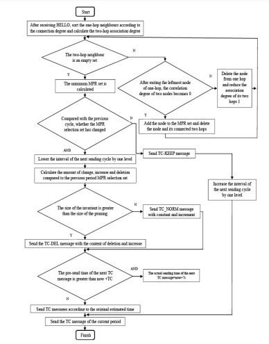 In the original protocol, TC messages are sent at a fixed period, which will lead to the following two problems: 1) When the network topology changes, the fixed sending interval cannot notify the entire network of the topology change in time, which may lead to untimely update of the network topology and packet loss 2) When the network topology around the node is relatively stable, a shorter sending cycle will lead to an increase in network control overhead and end-to end delay.