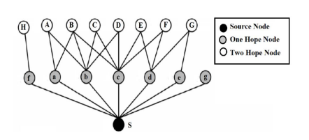 Step 1: Calculate the connection relationship between one-hop neighbors and two-hop neighbors, f={H}, a={A, B}, b={A, B, C, D}, c={B, C, D , E, F}, d={E, F, G}, e={G}, g={}. According to the number of connected two-hop neighbors, sort the one-hop neighbours from small to large and delete the nodes with a connection degree of 0. The sorted one-hop neighbors can be obtained as N1(i)={e, f, a, d, b, c}.