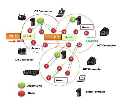 The routing data displayed in Table 1 indicates that a secondary route exists between the destination and the neighboring node, which differs from the primary path. The dense arrow symbolizes the initial transition that takes place within the cluster, traversing Area1, Area2, and Area3, from the origin to the endpoint. For greater specificity, the arrangement of nodes can be denoted as follows: A->D->F->E. The purpose of a node A inquiry into whether neighboring nodes C or B provide information regarding the accessibility of an alternate path to the target is to ascertain whether those nodes have connections to other clusters via distinct nodes. Subsequent to the inquiry, we shall elaborate on the Nodes Clustering Based on the IoT (NCIoT) proposal and its algorithmic implementation for determining the Head entity’s optimal positioning. The equations incorporate factors such as distance and power consumption.