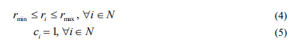 where rmin and rmax are the minimum and maximum communication range of each node, respectively. Equations (4) is the constraints of the communication range of sensor nodes. Equations (5) is the constraints of network connectivity, where ci is a variable indicating whether the node I is the connected node or not, determined by.
