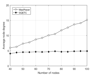 Next, we examine the average node degree versus the number of nodes. The results are shown in Figure 4 and Figure 5 for the cases where the desired degree is 4 and 5, respectively. We can observe that, in the default case (MaxPower), the larger the number of nodes, the higher the average node degree. This is obvious because when the number of nodes is large, the node density is thicker. Because the MaxPower algorithm configures the topology using the maximum communication range, each node will have many neighbors. For the SQETC algorithm, the average node degree is close to the desired degree even when the number of nodes is large. Specifically, considering the case of the desired degree of 4, the topology obtained by the SQETCalgorithm has an average degree of 3.71 (Figure 4). In the case of a desired degree of 5, the average node degree of the topology is 4.82 if the SETC algorithm is used.