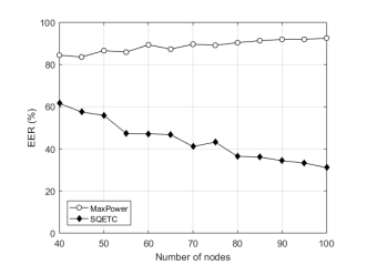 The results obtained in Figure 6 and Figure 7 show that, the EER in the case of using the SQETC algorithm is much lower than that of the MaxPower algorithm. Considering the case of total nodes is 50, the EER for the case of MaxPower is 86.64%. Meanwhile, if using the SQETC algorithm, the EER is only 48.22% and 55.90% respectively for the cases where the desired node degree is 4 and 5. For the cases where the number of nodes is larger, the EER is lower when the number of nodes is higher. Thus, the SQETC algorithm brings high energy efficiency, especially with WSNs where the nodes are highly distributed.