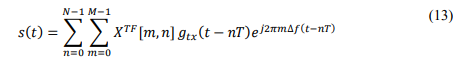 Each data frame in this scenario has a total frame duration of 𝐵 = 𝑁𝑇 and a bandwidth of 𝑇𝑠 = 𝑁 ∆𝑓 .After reshaping the matrix 𝑋 𝑇𝐹[𝑚, 𝑛]into a time frequency domain sequence, the transmitted OTFS signal, denoted s(t), can be derived by applying the Heisenberg transform to 𝑋 𝑇𝐹with the transmitter shaping pulse, 𝑔𝑡𝑥(𝑡). More specifically, the Heisenberg transform can be viewed as a multicarrier modulator. This Heisenberg approach involves using the conventional OFDM modulator. In particular, with conventional OFDM modulation, the Heisenberg transform could be achieved by an inverse fast Fourier transform (IFFT) module and transmit pulse shaping. In this scenario, the transmitted signal 𝑠(𝑡)using Heisenberg Transform as proposed by [11], [17], [18]and [19].