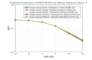 Figure 7 and Figure 8 clearly show that for a given SNR value, BER increases with estimated speed. This is a common observation when analyzing the performance of communication systems at different speeds. The modulation schemes are respectively 4-QAM for Figure 7 and 16-QAM for Figure 8.As the estimated speed increases, the BER increases accordingly, indicating a deterioration in system performance. As shown in Figure 8, since the higher order modulation scheme requires a higher SNR to obtain a good BER, we evaluate the BER from 0 dB to 15 dB, when the modulation scheme is 16-QAM. We observe that both low and high rate OTFS achieve the best BER.