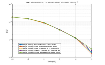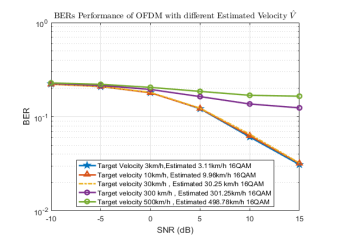 As shown in Figure 5, we have chosen five values for the speed estimate, e.g. (3km/h, 10km/h, 30km/h, 200km/h, 500 km/h). When the value of the speed estimate (3km/h, 10km/h, and 30km/h) is low, these cases have similar BER values. When the speed estimate is increased to 200 km/h and 500km/h, we find that the BER is the highest among those values. Furthermore, we find that the BER for high speed increases, as the signal power allocated to the channel speed causes inaccurate channel estimation and failure data detection.