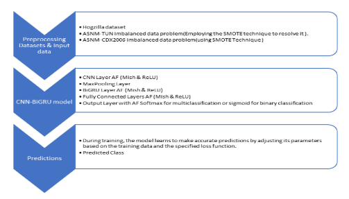 We Implemented the Mish throughout the CNN-BiGRU, the study involves a comparison between Mish and ReLU. The assessment includes an evaluation of accuracy, precision, recall, and other relevant metrics on datasets for intrusion detection. This comprehensive empirical analysis aims to provide insights into the efficacy of Mish and ReLU in capturing spatial and temporal patterns for enhancing the intrusion detection capabilities of the CNN-BiGRU model or similar hybrid deep learning model.