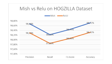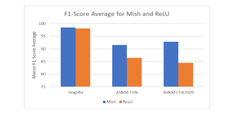 Figure 5 visually demonstrates the superiority of Mish over ReLU based on the macro F1-score, a metric crucial for evaluating the overall effectiveness of classification models. The macro F1- score considers both precision and recall across all classes, providing a balanced assessment of the model’s performance.