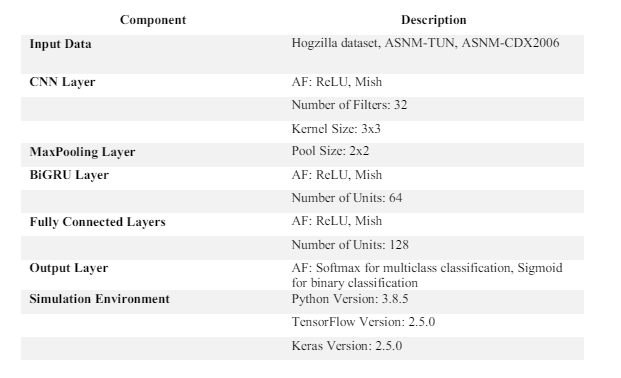 The table 2 outlines the components of the CNN-BiGRU model, including the layers, AF, and parameters such as the number of filters, kernel size, pool size, number of units, and number of classes. Additionally, it specifies the simulation environment.