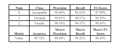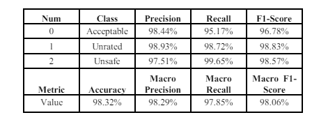 -Label encoding (0, 1, 2) for multi-class labels (‘Acceptable’, ‘Unrated’, ‘Unsafe’).