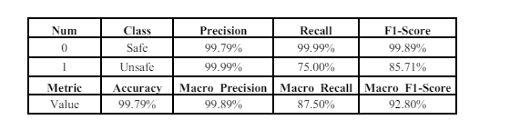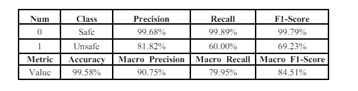 The dataset we utilized contained a substantial class imbalance, with the majority class, labeled as SAFE, comprising 5692 instances, and the minority class, labeled as UNSAFE, having only 43 instances. SMOTE was applied as a data augmentation.