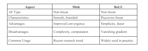 Mish, being a recent research trend, exhibits characteristics such as smoothness and boundedness, contributing to improved convergence during training. However, Mish may entail higher computational complexity compared to ReLU. On the other hand, ReLU, widely used in practice, offers simplicity and faster computation but is susceptible to issues such as vanishing gradients. This comparison highlights the trade-offs and considerations associated with choosing between Mish and ReLU for intrusion detection tasks. Our numerical results further complement this analysis, providing quantitative evidence of their performance on various datasets.