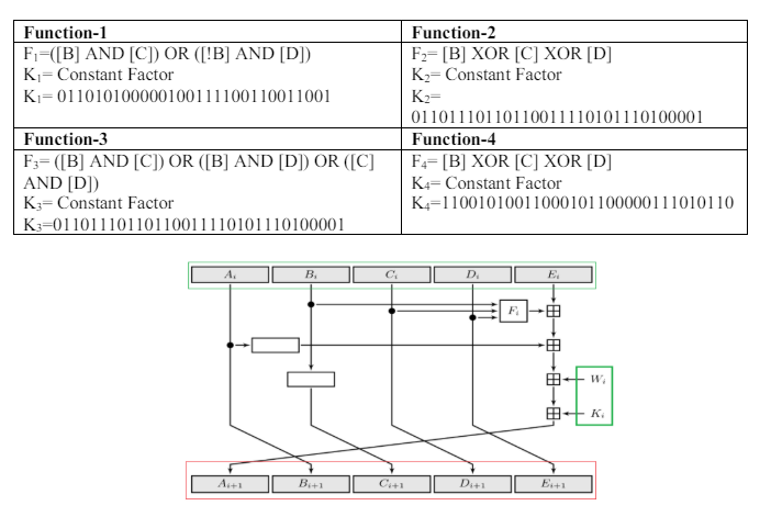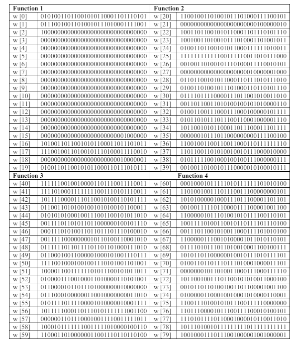 The terms from Tables 2 and 3 were analyzed, and the results were then organized into four categories (Function1, Function2, Function3, and Function4) as shown in Table 4. SHA-1 employs five 32-bit variables (A, B, C, D, and E) as the initial hash values as shown in Table 5. These primary hash values come from the decimal parts of the square roots of prime numbers and are used as constants.