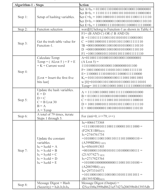 In computing, a hash function is a procedure that accepts an input of variable length and returns an output of fixed length, often called a “fingerprint.” The index into a “HASHTABLE” is a common application of such a function. Cryptographic hash functions are ideal for use in digital signature schemes and message integrity verification because of their extra features. A public key kp and a secret key ks are used in conjunction with two functions, Sign(M, ks), which generates a signature S, and Verify (M, S, kp), which returns a BOOLEAN indicating whether or not the given S is a valid signature for message M. Sign(M, Sign(M, ks), kp) = true for any given key pair (ks, kp) is a necessary condition for any function to satisfy [1-7]. Conversely, it should be unattainable to fabricate a counterfeit signature. Two sorts of forgeries can be differentiated: Universal forgeries and Existential forgeries [8-19].In the first scenario, the attacker uses the public key kp to generate a valid M, S pair. The attacker has no control over the message being computed; as a result, M is often generated at random. The attacker generates a valid signature S from the provided M and kp to establish a universal fake. Such a signature can be placed using a public-private key cryptosystem, such as RSA [20-26]. Here, the private key pair (n, d) is used to sign the message, while the public key pair (n, e) is used to authenticate the signature. Calculating the private part of the RSA key scheme efficiently enough to pull off a universal forgery is thought to be impossible. Finding an existential forgery, on the other hand, is a breeze: for any arbitrary S, we can easily determine the matching message M by solving M = Se% n. A further problem is that RSA can only sign messages up to a certain length; a simple but poor workaround would be to split the message up into blocks and sign them individually. A new message with a valid signature can be created, but an attacker can now rearrange the blocks to do so. In conclusion, the RSA method is somewhat sluggish. These issues may be fixed by using cryptographic hash functions. Such a hash function H, as was previously indicated, accepts a message of variable length as input and outputs a message digest D of defined length. A communication’s digest is now signed instead of the original message itself. It is necessary to identify message M, given D, such that H(M) = D in order to establish an existential forgery. As shown in Figure 1 [8, 27-31], the SHA-1 algorithm’s block diagram.