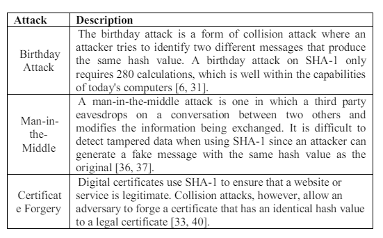 The SHA-1 hash method was long thought to be impenetrable, however it has since been found to be vulnerable to a number of attacks. It is possible to identify two different messages that generate the same hash result, which is SHA-1’s fundamental vulnerability. As shown in Table 7, this can be used in a variety of attacks [31].