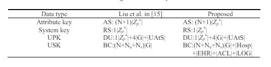 Based on phases and participants, Table 4 depicts comparison of computation overheads between Liu et al.’s scheme and the proposed one because the other three related works are unclearly defined on their operations and also were not focused on the healthcare application nor not using attribute-based access control. For the sake of simplicity and without sacrificing generality, our focus was directed towards computationally intensive operations such as hash operation (H), bilinear map (E), pairing operation (P) and blockchain consensus BCc. But the other operations were ignored, which are cost-lightened operations.