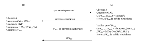HS gets MPK, chooses a random number ISKHS=β, which is an identifier private key, and computes its incomplete public key IPKHS’=g β . Then, it constructs a zero-knowledge proof (ZKP), ΨPoK = , of its private identifier key as follows: HS selects μ ← Zp to compute u = g μ , c = H2(g||IPKHS’||u) and ξ = μ – cβ (mod p). Then, HS sends ΨPoK to AS. AS verifies the ZKP as follows: AS computes c = H2(g||IPKHS’||u) and checks if u = g ξ (IPKHS’) c . If that passes, AS issues a complete public key IPKHS=(g β’ ) γ’ with a newly selected random number γ’. Then, AS sends the public key back to HS. Figure 2 shows the process.