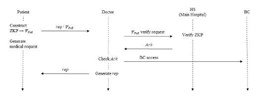 First of all, patient constructs a ZKP signature ΨPoK_A on a self-selected random number r ← Zp * and R = gr and sends this proof with a medical service request to the doctor as follows: Let req be the patient’s medical service request message and TSPT be a timestamp of patient. Patient encrypts req using his (or her) AUKPT (attribute key) as Creq = EAUKPT(req). Patient computes f = H1(TSPT||Creq||R), p1 = f r and Z = f λ with the secret identifier key λ. Patient computes c = H2(f||AUKPT||Z) and y = r + cλ (mod p) and sends ΨPoK_A = along with {TSPT, Creq, R, p1} to the doctor. After doctor receives ΨPoK_A, doctor sends it for verifying the proof to HS. Then, HS verifies this proof as follows: it computes f’=H1(TSPT||Creq||R) and c’ = H2(f||AUKPT||Z) with the blockchain-stored keys of the patient AUKPT and IPKPT. After that, it checks if the following equation holds f’y = p1Z c’. If the validation check holds, it sends an acknowledgement Ack ∈ G to doctor. Then, doctor accesses to blockchain which stored AUKPT and patient’s medical information. Using AUKPT, doctor checks req’ by decrypting Creq as req’ = 𝐷AUKDO(Creq). After confirming the request, doctor generates an appropriate response message Rep on the patient’s request based on the information stored in blockchain. Finally, doctor sends Rep to the patient.