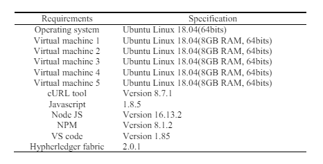 Table 2 shows the requirements and specifications for the functionality implementation of the proposed system. Five numbers of virtual machines have been deployed to put system entities roles in our implementation. They are for HS, AS, patient and two doctors. PBFT is used for the public blockchain consensus and virtual machine 1 works as the authority for the private blockchain.