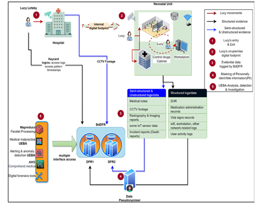 The Lucy Letby case concerns a nurse in the United Kingdom who was arrested and charged with multiple counts of murder and attempted murder of infants in her care at the Countess of Chester Hospital neonatal unit [10]. The murders are believed to have begun in 2015 and were detected in 2018 when an investigation was initiated. In the context of DFR, BdDFR, utilising UEBA analytics, would have played a crucial role in uncovering any suspicious activities, patterns, or discrepancies in a timely manner and alerted the relevant IRT as depicted in Figure 4 below and explained in the subsequent sections.