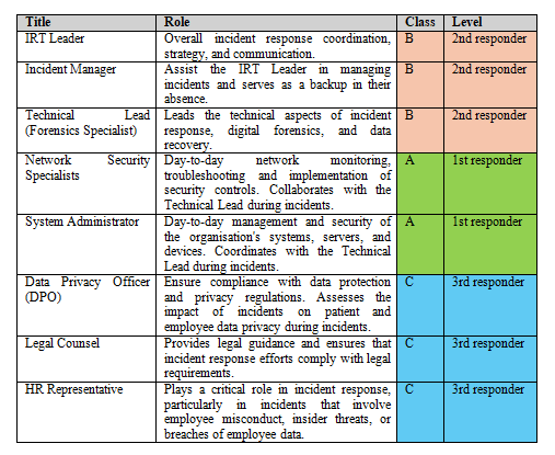 Table 1 below denotes the full forms of the acronyms used in Figure 1 (WMN DFR framework overview). Table 2 highlights the Incident Response Team (IRT), their roles, classes and levels.