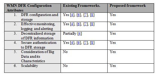 Having evaluated the proposed WMN DFR framework, Table 4 below presents a comparison between existing WMN DFR frameworks and the proposed framework in the current research.