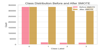 Figure 3 shows the distribution of the classes before and after using SMOTE to balance the dataset. We can see that the number of samples for each class is balanced after SMOTE, which can improve the performance of our machine-learning models. The objective of this step is to preprocess the data and make it suitable for the machine learning models.