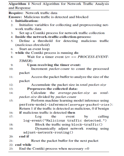 – The algorithm initializes some variables for collecting and preprocessing network traffic data, such as packet count, totalPacketSize, and averagePacketSize. The algorithm sets up a Contiki process (networkTrafficCollectionProcess) for network traffic collection.