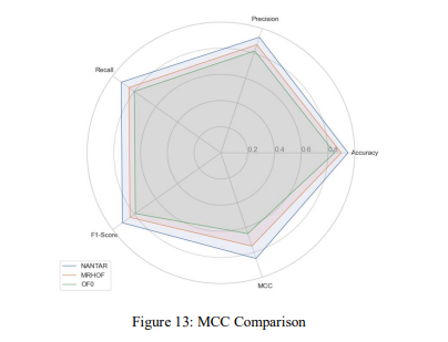 The MCC is a measure used in machine learning to assess the quality of binary classifications. The measure considers both true and false positives and negatives, making it a balanced metric suitable even for imbalanced class sizes. The MCC is in essence a correlation coefficient between the observed and predicted binary classifications; it returns a value between -1 and +1. A coefficient of +1 represents a perfect prediction, 0 is no better than a random prediction, and -1 indicates total disagreement between prediction and observation. The results in Figure 13 showing that NANTAR scored an MCC of 0.85, while MRHOF scored 0.75 and OF0 scored 0.65, are significant. Here is a discussion of the implications of these findings: