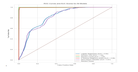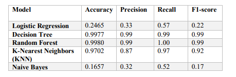 We implement and evaluate five machine learning models: Decision Tree, Random Forest, KNN, Naive Bayes, and Logistic Regression. These models are supervised learning algorithms that can learn from the labelled data and predict the class of the new data. The scikit-learn library in Python is used to train and test the models on the balanced dataset. We split the data into training and testing sets using a 70:30 ratio, which is a common practice for machine learning experiments. The training set is used to fit the models and the testing set is used to evaluate the models using the evaluation metrics.