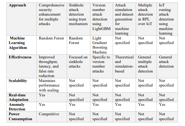 While several studies have made strides in applying machine learning to enhance RPL security, gaps remain that our proposed approach seeks to address. For instance, in [22] simulation-based datasets provide a foundation for attack detection, yet they do not fully capture the unpredictable nature of RPL network traffic. Authors [23]’s multiple attack detection techniques underscore the adaptability of machine learning, but they often require extensive computational resources that may not be feasible in all IoT devices.