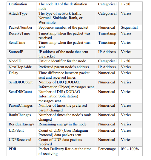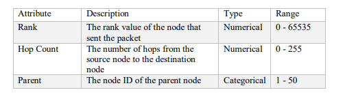 The data was created by simulating different network topologies and scenarios with varying numbers of nodes, traffic patterns, and attack types using the Cooja simulator [26], which is a network simulator for low-power wireless devices. The IoT devices used the Contiki operating system, which supports the RPL protocol. The network traffic was captured using Wireshark [27], which is a network protocol analyzer. The data consists of the RPL packets that are exchanged between the nodes in the network. Each packet has a set of features and a label that indicates its characteristics and status. The features are rank, hop count, parent, and destination, which represent the routing information of the packet. The data is labelled with Normal for benign traffic and three types of attacks: Rank, blackhole, and Wormhole. Table 2 shows the description of the dataset attributes.